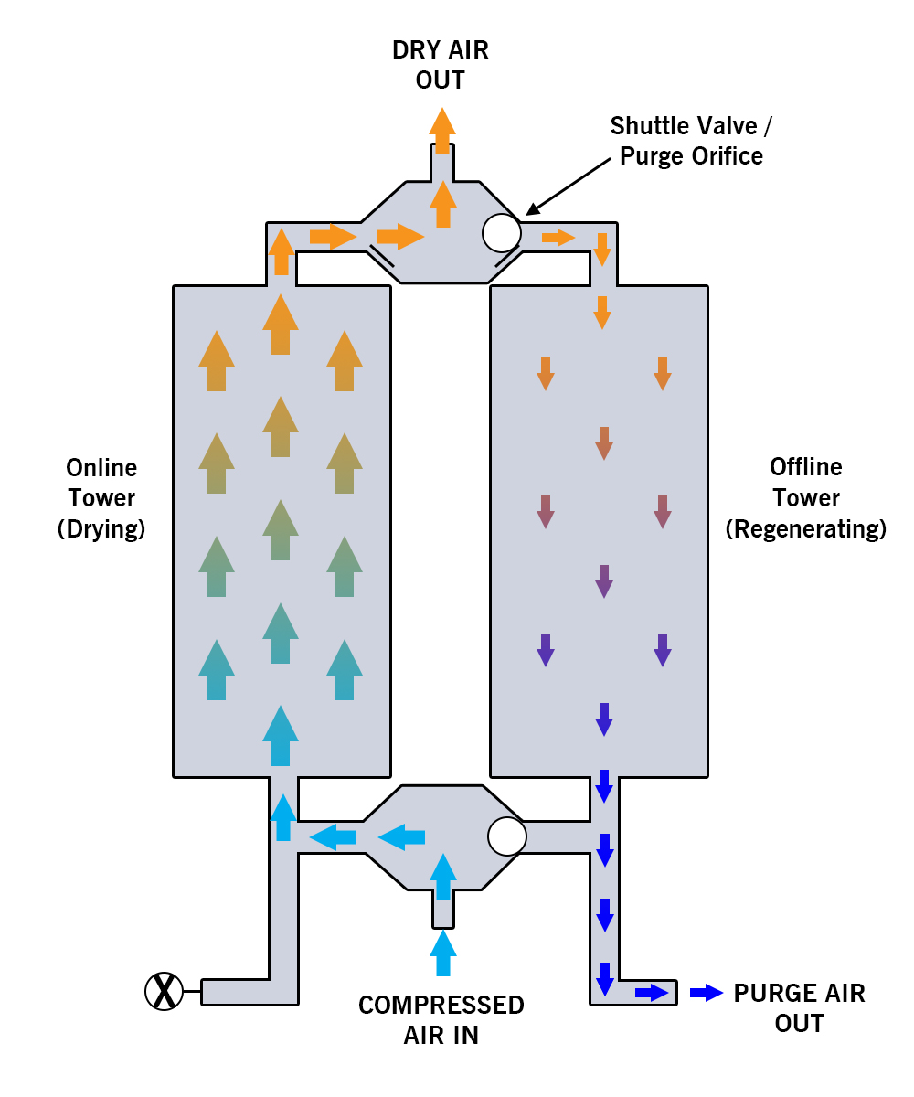 There are several types of regenerative desiccant air dryers: heatless, heated (internally or externally), blower purge, and heat of compression. We are going to focus on the most popular and common type: Heatless regenerative desiccant air dryers. These air dryers use a process called Pressure Swing Adsorption to consistently provide clean dry air. These are one of the simplest forms of regenerative desiccant air dryers and are an economical option but do have a hidden cost.